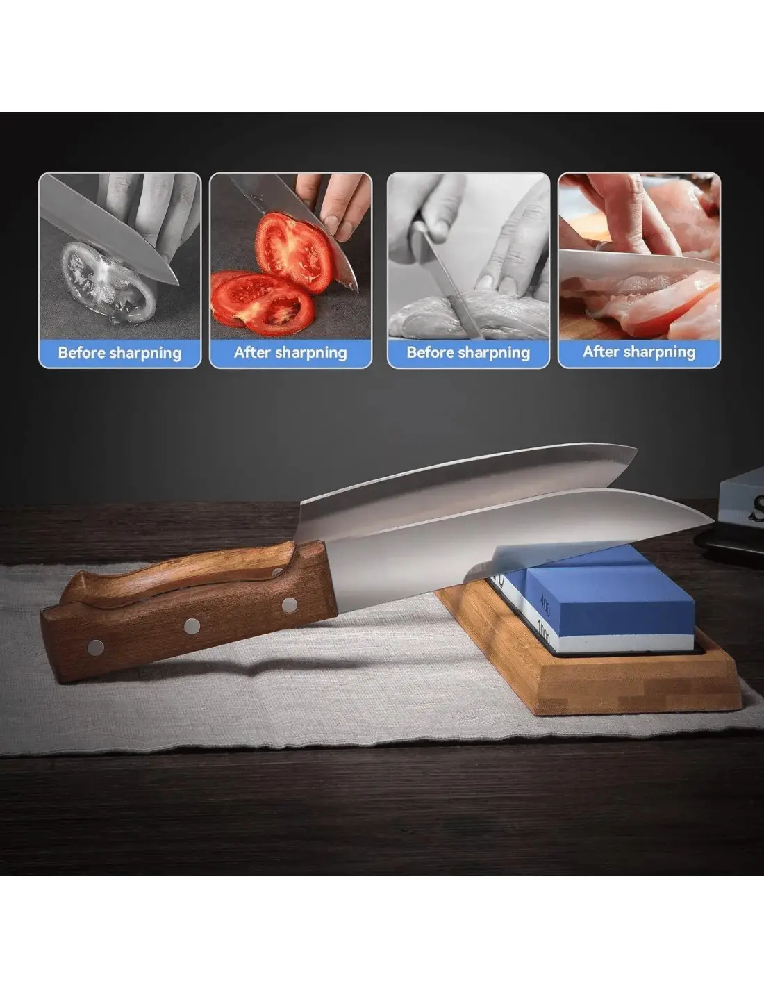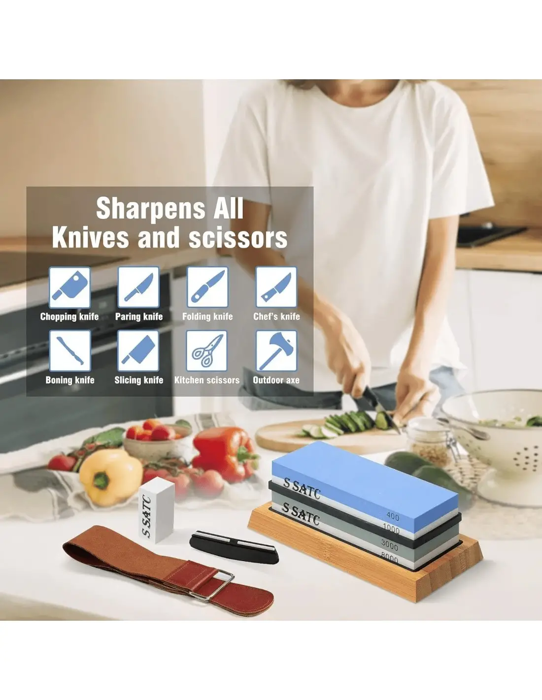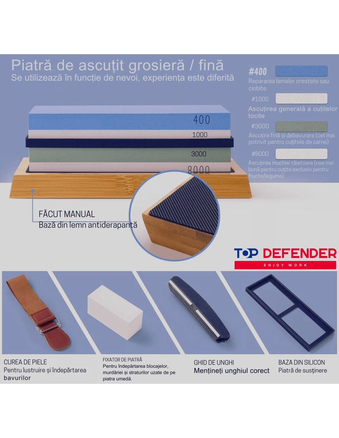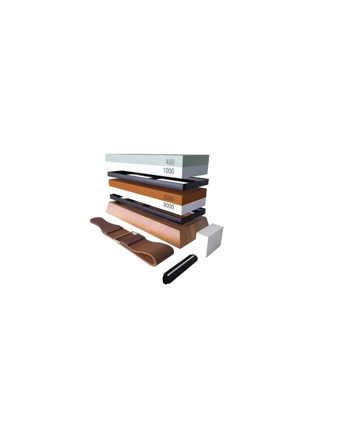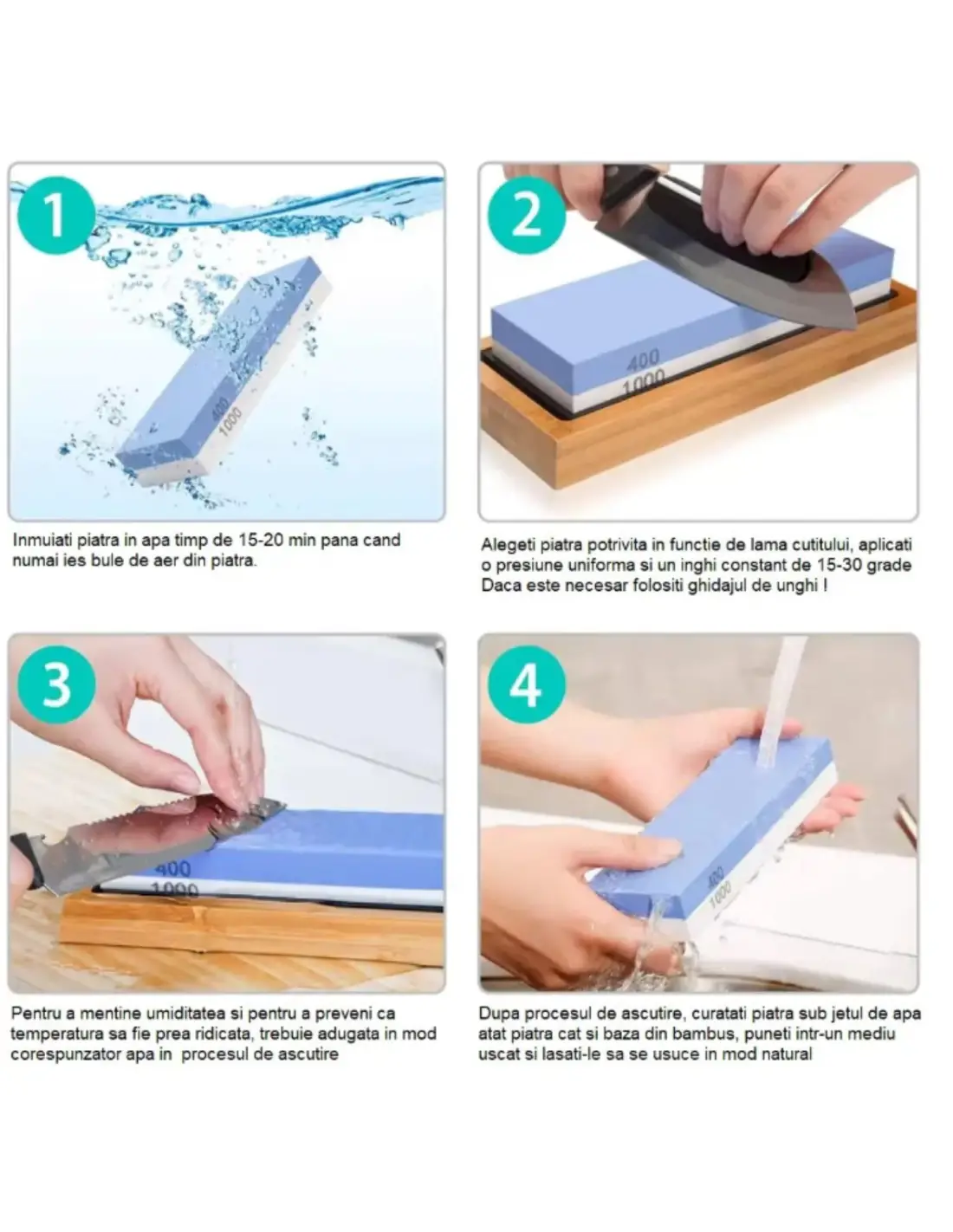 Set profesional de pietre de ascutit din corindon, cu granulatii 400/1000 si 3000/8000, suport bambus, curea de piele, ghidaj si piatra de reparatie.