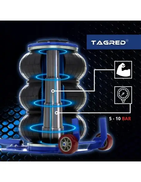 Cricul pneumatic TAGRED 3,5T este un echipament profesional de ridicare rapida si sigura a vehiculelor, ideal pentru service-uri auto, vulcanizari si ferme. Designul tip om de zapada, cu burduf ranforsat si pistoane de putere marita, permite ridicarea vehiculelor cu o greutate de pana la 3,5 tone intr-un singur punct.
