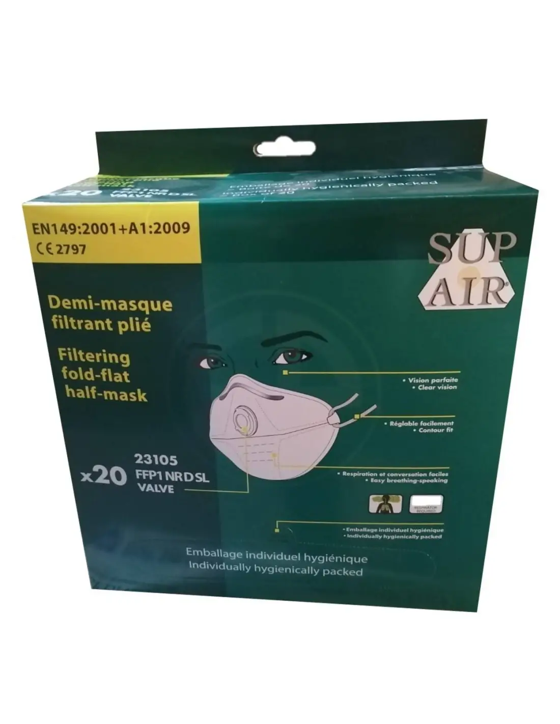 Masca de protectie SUPAIR FPP1 NR D. Aceasta asigura protectia impotriva pulberilor inerte si a corpusculelor solide sau lichide nepericuloase (de exemplu, ciment, celuloza, portelan-caolina, cauciuc, filati de fier, pulbere de carbune, ulei vegetal, faina s.a.).
