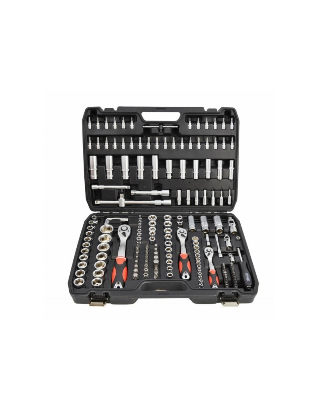 Cheie cu clichet - dimensiuni 1/4", 3/8" si 1/2" cu maner ergonomic. Clichet cu 72 de dinti si cursa de 5 grade. Setul include prize, biti, bara de extensie, imbinari si alte accesorii. Carcasa este robusta din plastic. Zavor metalic pentru inchidere si deschidere eficienta. Excelent pentru lucrari de bricolaj, precum si pentru lucrari de instalatii sanitare, mecanice si electrice.